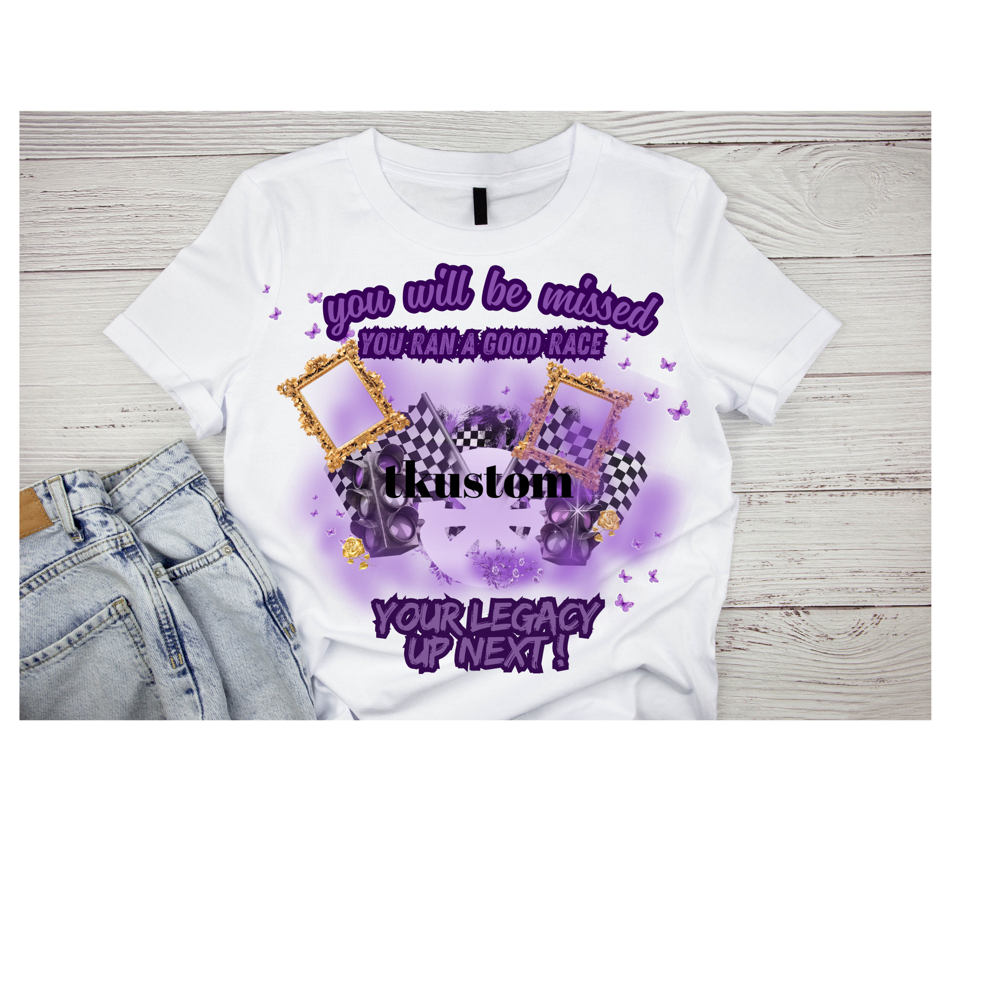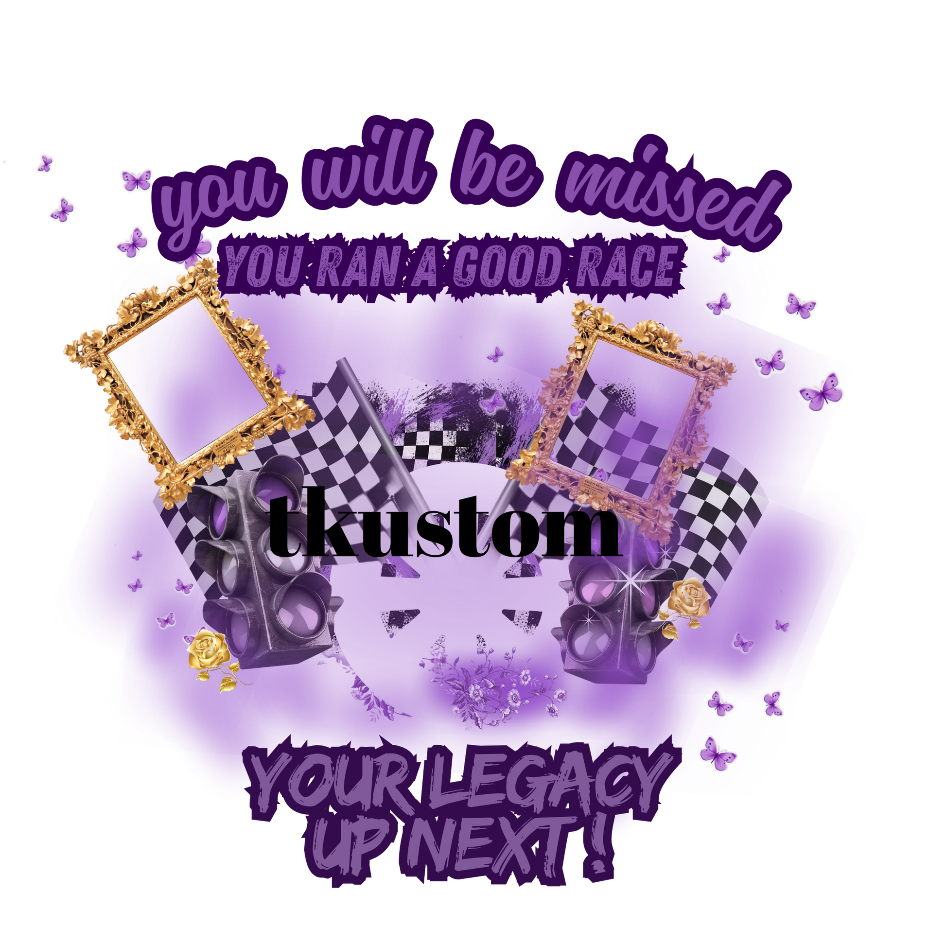 This touching design features the message 'you will be missed - you ran a good race' with 'your legacy up next!' Perfect for commemorating racing enthusiasts, athletes, or anyone who lived life in the fast lane.